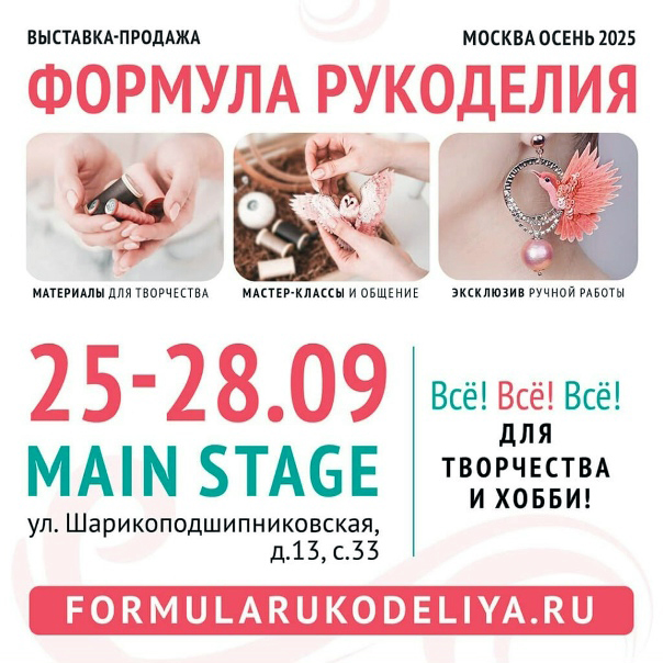 25 — 28 сентября , ФОРМУЛА РУКОДЕЛИЯ, Москва, ул. Шарикоподшипниковская, д. 13, стр. 33, MAIN STAGE, метро «Дубровка» и « Волгоградский проспект».